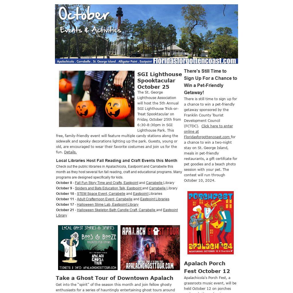 | There's Still Time to Sign Up For a Chance to Win a Pet-Friendly Getaway! There is still time to sign up for a chance to win a pet-friendly getaway sponsored by the Franklin County Tourist Development Council (FCTDC). Click here to enter online at Floridasforgottencoast.com for a chance to win a two-night stay on St. George Island, meals in pet-friendly restaurants, a gift certifcate for pet goodies and a beach photo session with your pet. The contest will run through October 10, 2024.