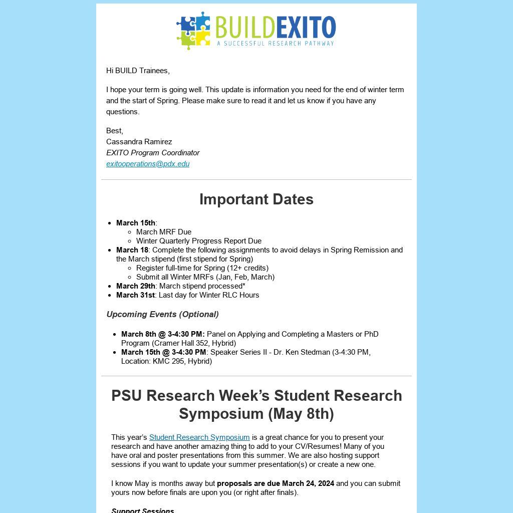 I hope your term is going well. This update is information you need for the end of winter term and the start of Spring. Please make sure to read it and let us know if you have any questions.