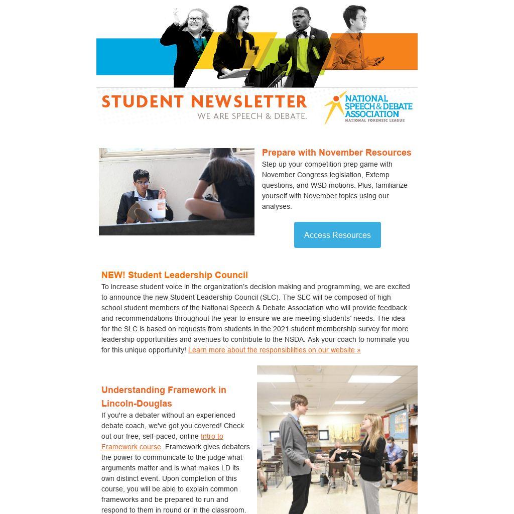 To increase student voice in the organization’s decision making and programming, we are excited to announce the new Student Leadership Council (SLC). The SLC will be composed of high school student members of the National Speech & Debate Association who will provide feedback and recommendations throughout the year to ensure we are meeting students’ needs. The idea for the SLC is based on requests from students in the 2021 student membership survey for more leadership opportunities and avenues to contribute to the NSDA. Ask your coach to nominate you for this unique opportunity! Learn more about the responsibilities on our website »