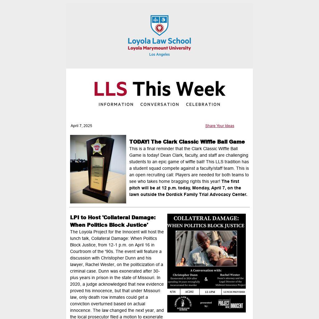 The Loyola Project for the Innocent will host the lunch talk, Collateral Damage: When Politics Block Justice, from 12-1 p.m. on April 16 in Courtroom of the '90s. The event will feature a discussion with Christopher Dunn and his lawyer, Rachel Wester, on the politicization of a criminal case. Dunn was exonerated after 30-plus years in prison in the state of Missouri. In 2020, a judge acknowledged that new evidence proved his innocence, but that under Missouri law, only death row inmates could get a conviction overturned based on actual innocence. The law changed the next year, and the local prosecutor filed a motion to exonerate him, which was granted. That’s when the Missouri attorney general (AG) stepped in and appealed the release, kicking off a legal battle that’s still ongoing. Notably, the AG is facing a primary challenge from a former attorney of President Trump, and it has been alleged the AG is using the case to demonstrate that he is tough on crime.