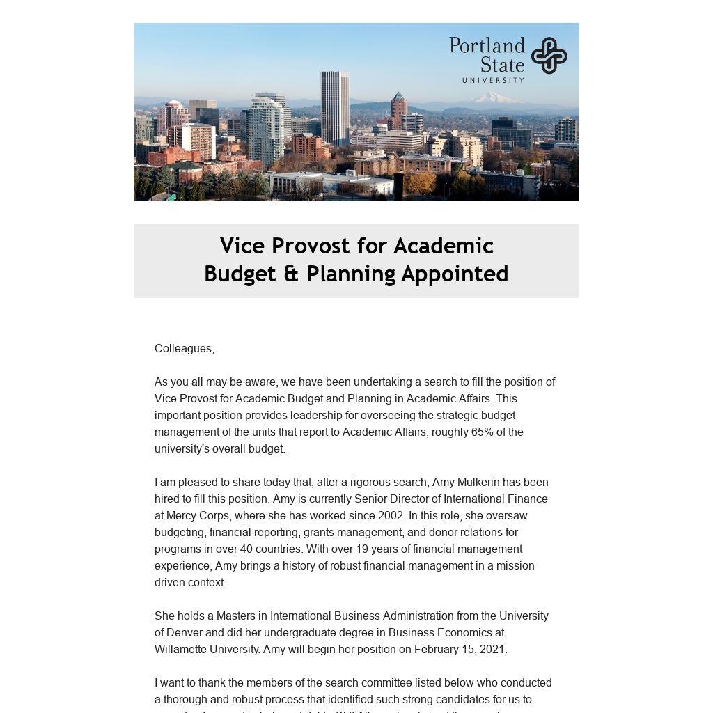 I want to express my extreme gratitude to Dave Maddox, who so ably served in the role of Interim Vice Provost for the past eighteen months. Dave oversaw the development of the revised Academic Budget Allocation model and worked collaboratively throughout his time at PSU in ways that ensured transparency and primacy for academic priorities. I know that you all will join me in wishing him the very best in the next phase of his career. He has brought strategic insight, financial acumen, and generosity of spirit to his work in ways that benefitted us all. Dave will stay on to assist Amy with the transition, and his last day at PSU will be March 31, 2021.
