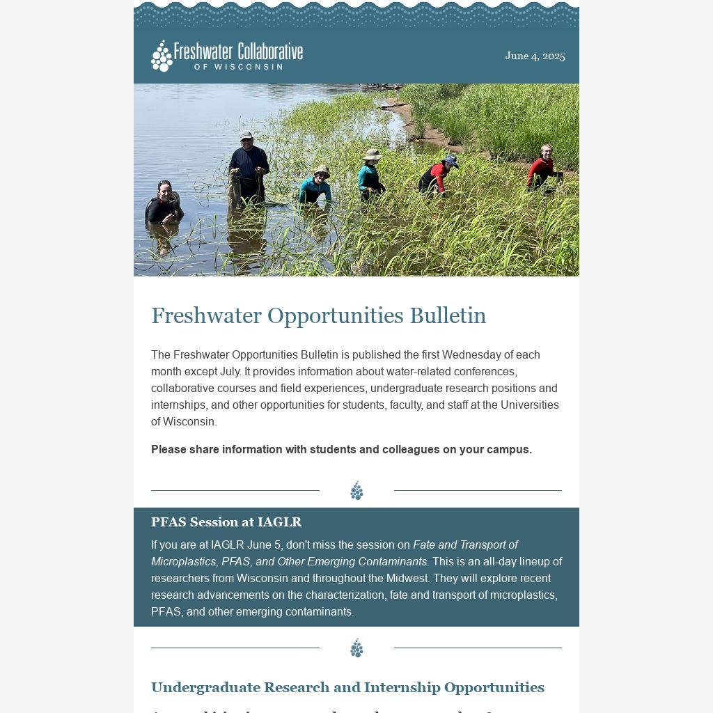 The Freshwater Opportunities Bulletin is published the first Wednesday of each month except July. It provides information about water-related conferences, collaborative courses and field experiences, undergraduate research positions and internships, and other opportunities for students, faculty, and staff at the Universities of Wisconsin.
