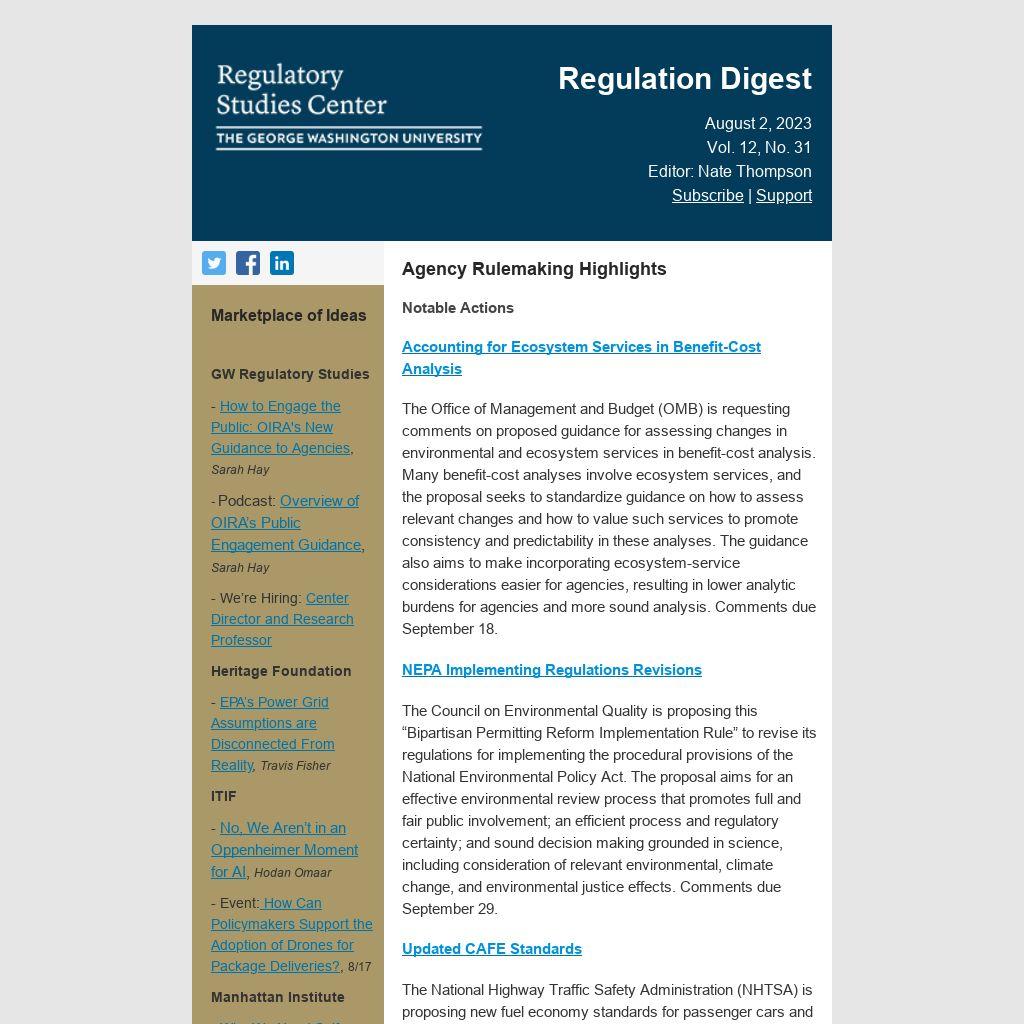 The Office of Management and Budget (OMB) is requesting comments on proposed guidance for assessing changes in environmental and ecosystem services in benefit-cost analysis. Many benefit-cost analyses involve ecosystem services, and the proposal seeks to standardize guidance on how to assess relevant changes and how to value such services to promote consistency and predictability in these analyses. The guidance also aims to make incorporating ecosystem-service considerations easier for agencies, resulting in lower analytic burdens for agencies and more sound analysis. Comments due September 18.