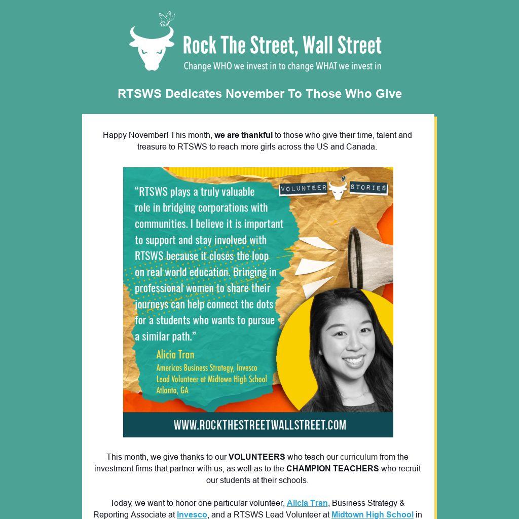 Today, we want to honor one particular volunteer, Alicia Tran, Business Strategy & Reporting Associate at Invesco, and a RTSWS Lead Volunteer at Midtown High School in Atlanta. Thank you, Alicia, for everything you give to RTSWS!