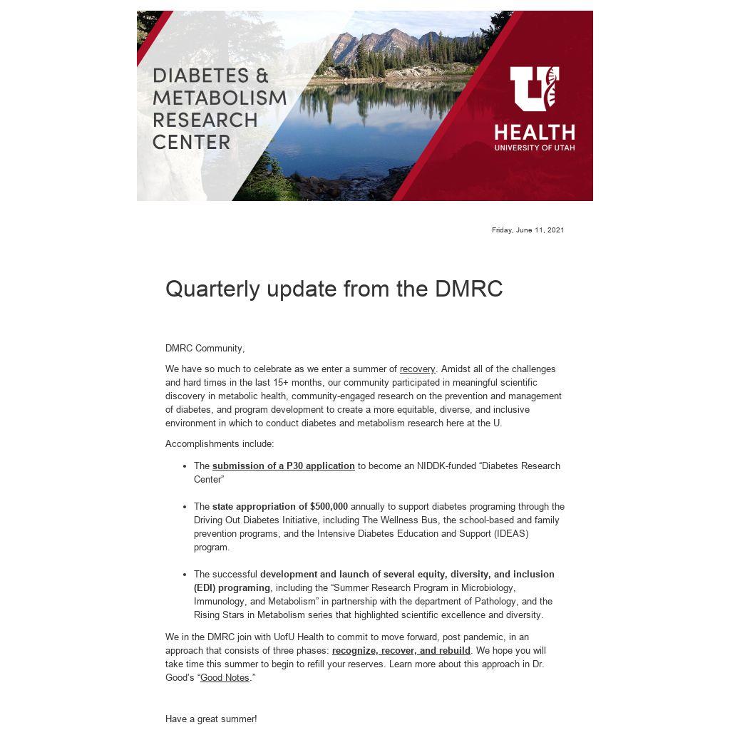 We in the DMRC join with UofU Health to commit to move forward, post pandemic, in an approach that consists of three phases: recognize, recover, and rebuild. We hope you will take time this summer to begin to refill your reserves. Learn more about this approach in Dr. Good’s “Good Notes.”