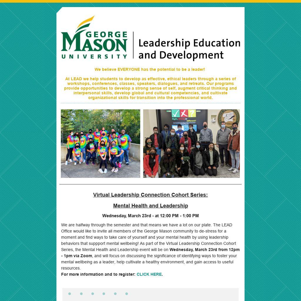 The Leadership Education and Development office (LEAD) and Graduate Student Life are pleased to host this year's Mason Leadership Summit. This year’s Summit is specifically design for Mason graduate students and it will take place virtually March 1-23, 2022. Students will have a chance to select which educational sessions they would like to participate and engage in.