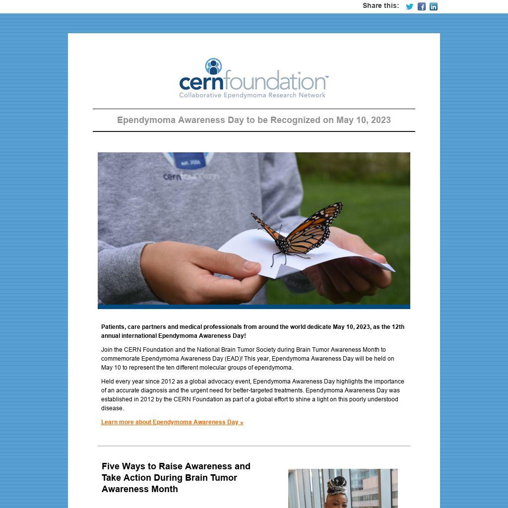 Join the CERN Foundation and the National Brain Tumor Society during Brain Tumor Awareness Month to commemorate Ependymoma Awareness Day (EAD)! This year, Ependymoma Awareness Day will be held on May 10 to represent the ten different molecular groups of ependymoma.