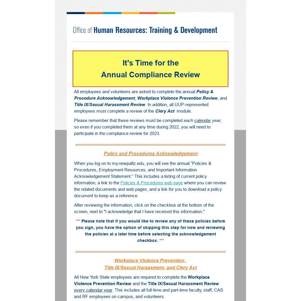 All New York State employees are required to complete the Workplace Violence Prevention Review and the Title IX/Sexual Harassment Review every calendar year. This includes all full-time and part-time faculty, staff, CAS and RF employees on campus, and volunteers.