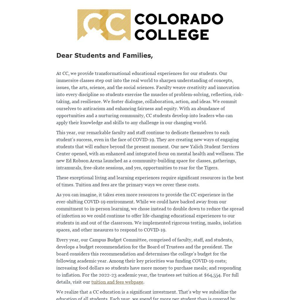 We are focusing on Project 2024, a process of listening, engaging, analyzing, and pursuing ways we can do what we do better. Students, staff, and faculty are having exciting conversations this year. Next year those ideas will be developed into an action plan, and in 2024, we will launch into the work to make CC even more impactful. Colorado College is an extraordinary residential liberal arts college, providing a depth of educational opportunities and experiences unlike anywhere else. Here, students innovate, learn from failure, develop resilience, grow into leaders, and make a difference in our world. Thank you for helping to make that possible.