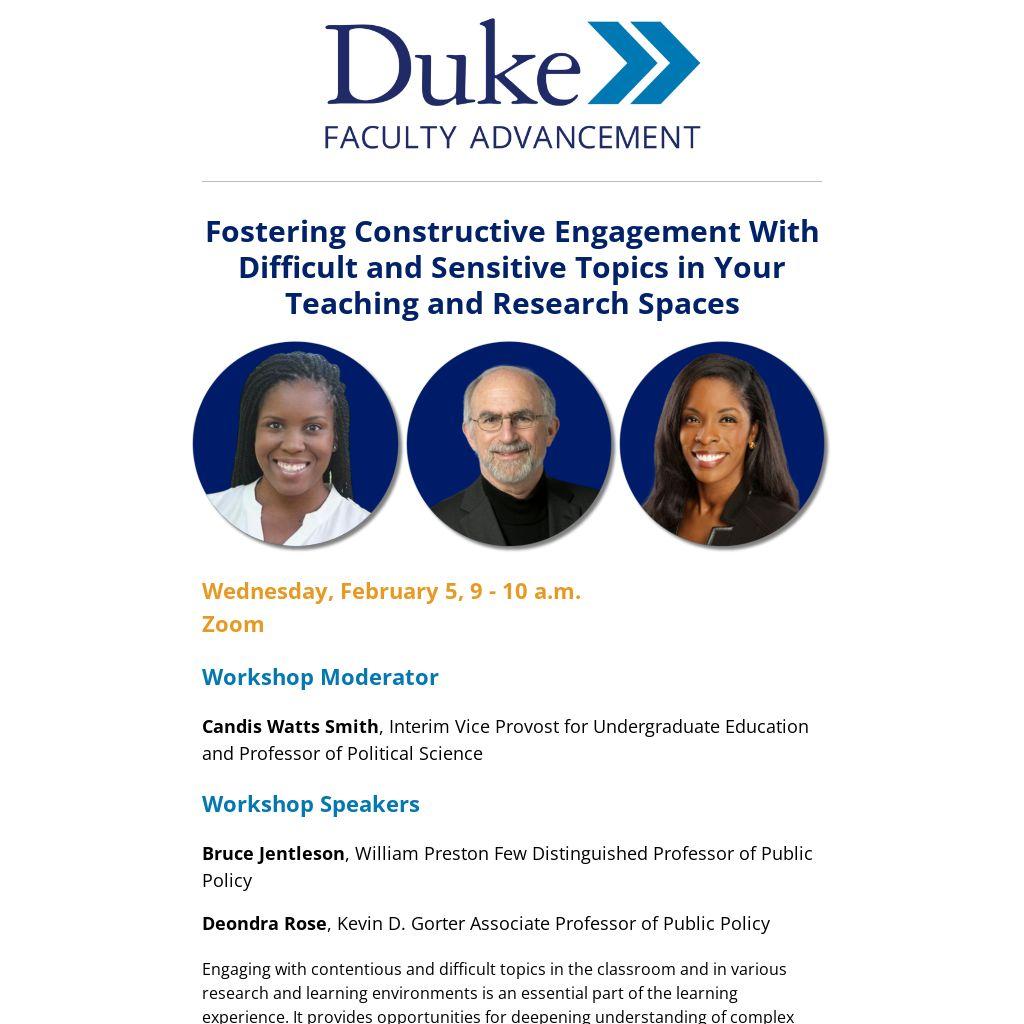 In this interactive workshop, experienced faculty will share strategies and best practices to foster learning environments where such meaningful and constructive dialogues can take place. They will also invite and engage with your questions and thoughts on how to manage challenging conversations and interactions in productive ways that maximize learning and understanding.