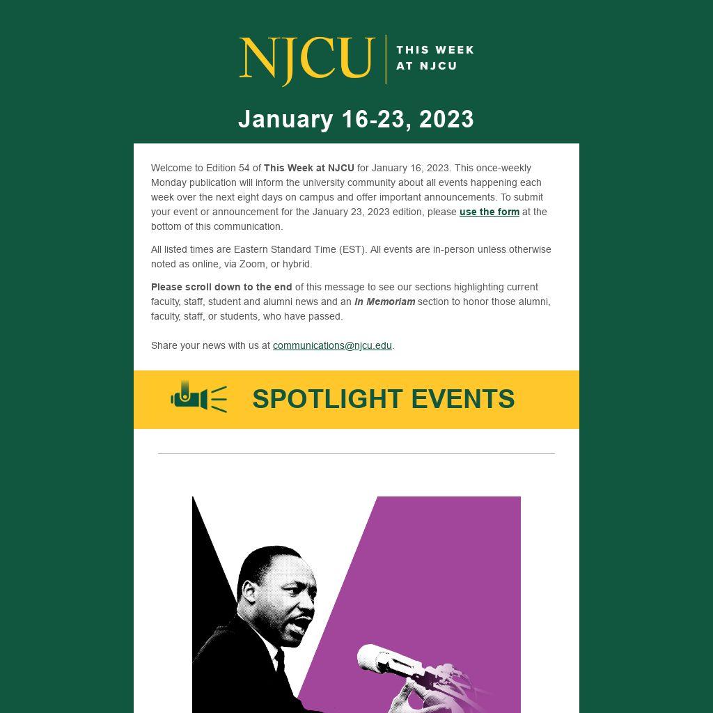 Welcome to Edition 54 of This Week at NJCU for January 16, 2023. This once-weekly Monday publication will inform the university community about all events happening each week over the next eight days on campus and offer important announcements. To submit your event or announcement for the January 23, 2023 edition, please use the form at the bottom of this communication.