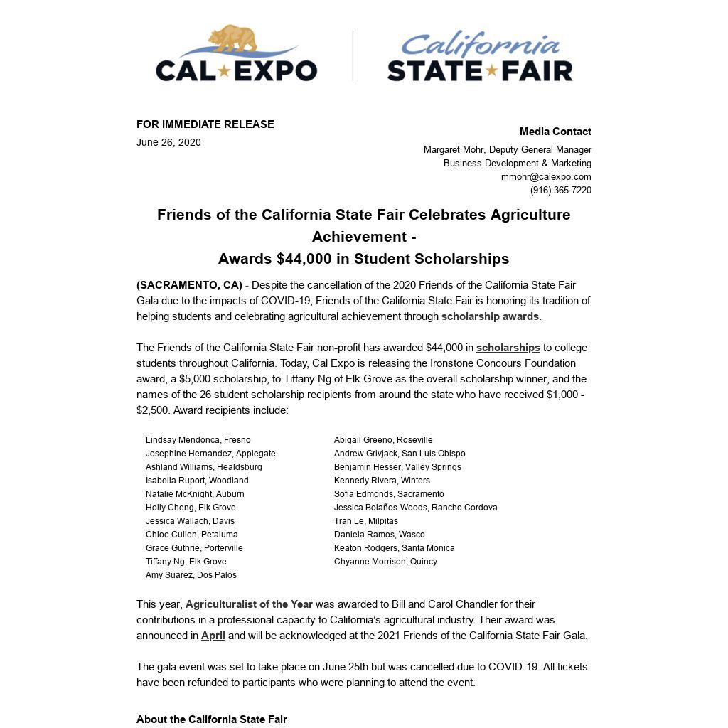 (SACRAMENTO, CA) - Despite the cancellation of the 2020 Friends of the California State Fair Gala due to the impacts of COVID-19, Friends of the California State Fair is honoring its tradition of helping students and celebrating agricultural achievement through scholarship awards.