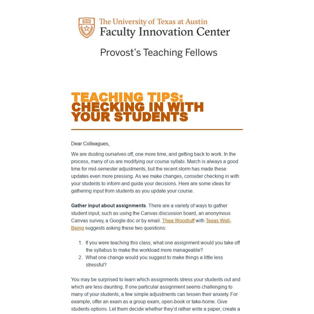 Gather input about assignments. There are a variety of ways to gather student input, such as using the Canvas discussion board, an anonymous Canvas survey, a Google doc or by email. Thea Woodruff with Texas Well-Being suggests asking these two questions: