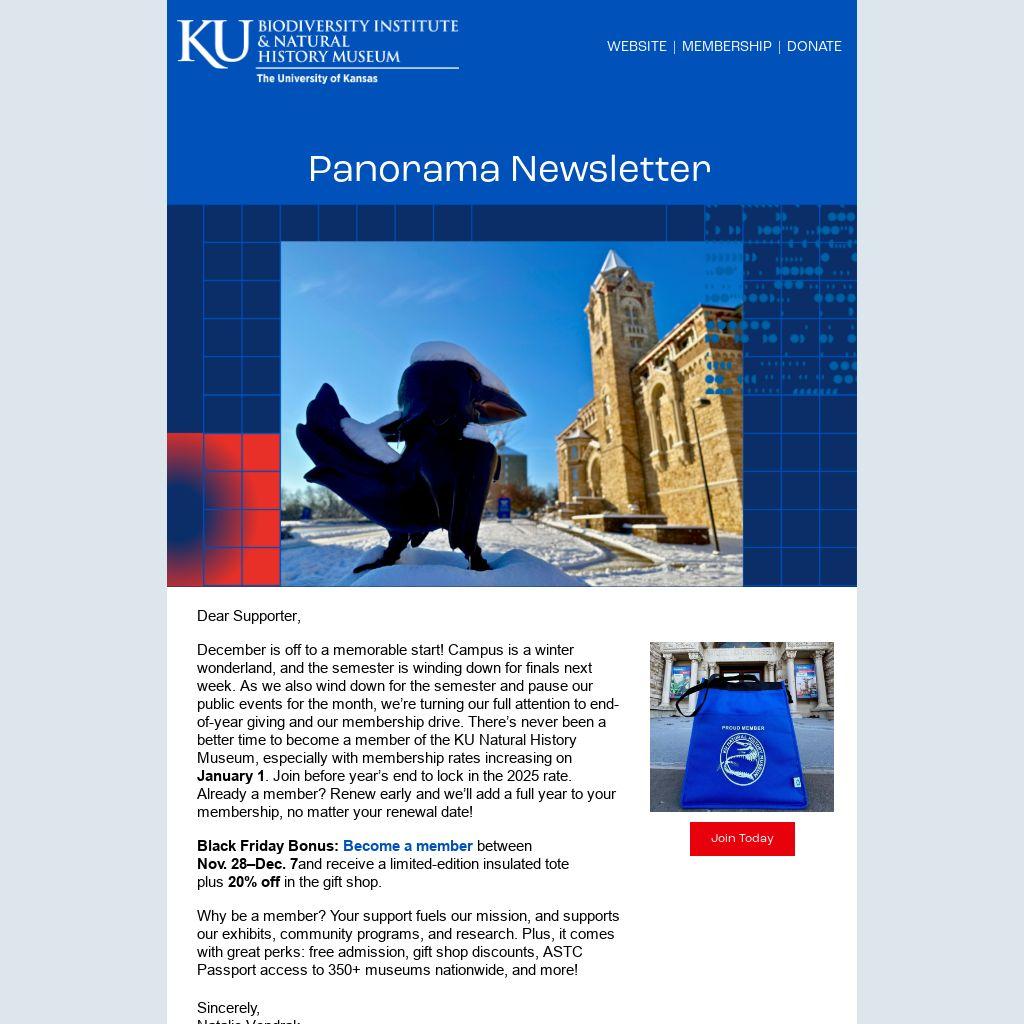 December is off to a memorable start! Campus is a winter wonderland, and the semester is winding down for finals next week. As we also wind down for the semester and pause our public events for the month, we’re turning our full attention to end-of-year giving and our membership drive. There’s never been a better time to become a member of the KU Natural History Museum, especially with membership rates increasing on January 1. Join before year’s end to lock in the 2025 rate. Already a member? Renew early and we’ll add a full year to your membership, no matter your renewal date!