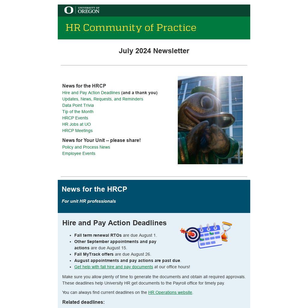 HR website upgrade: The HR website upgrade took place on June 28. You'll notice some differences in the way the site looks, but functionality should be the same. If you notice anything broken, missing, or odd looking, please email hrcommunications@uoregon.edu.
