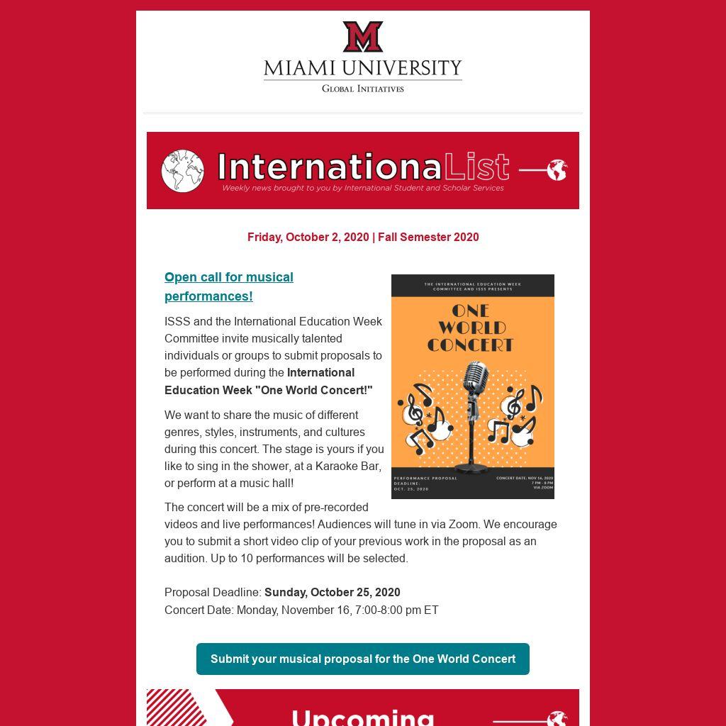 ISSS and the International Education Week Committee invite musically talented individuals or groups to submit proposals to be performed during the International Education Week "One World Concert!"