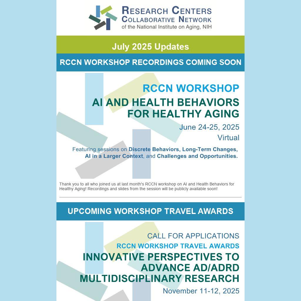 Follow us for updates on RCCN activities. In addition, for the starter pack of the RCCN centers and coordinating centers on Bluesky, click here. Please reach out to us at contact@rccn-aging.org if you have an NIA-funded center account we should add to our starter pack.