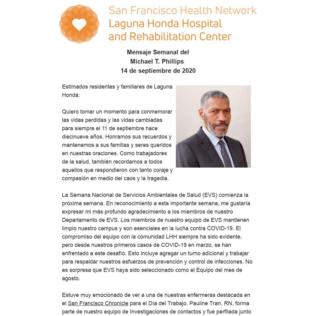 Como recordatorio, los paneles de COVID-19 con el personal de LHH y los números de casos de los residentes están disponibles en línea en LagunaHonda.org/COVID19/spanish