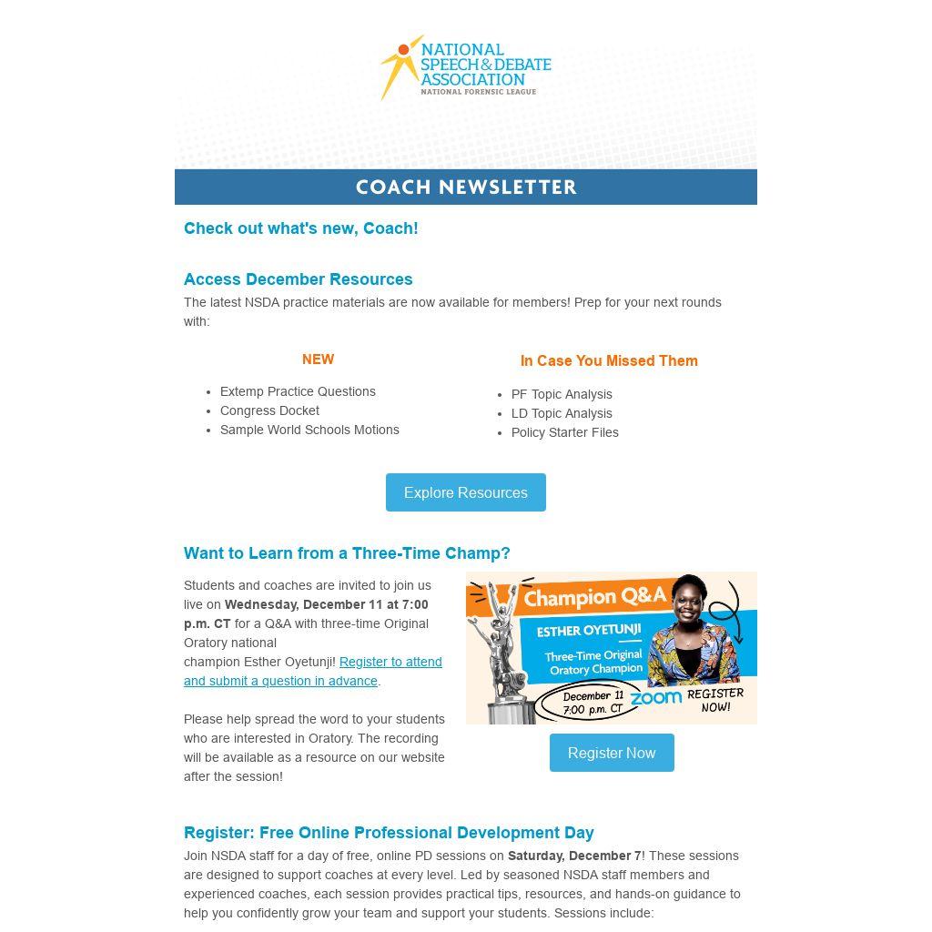 Join NSDA staff for a day of free, online PD sessions on Saturday, December 7! These sessions are designed to support coaches at every level. Led by seasoned NSDA staff members and experienced coaches, each session provides practical tips, resources, and hands-on guidance to help you confidently grow your team and support your students. Sessions include: