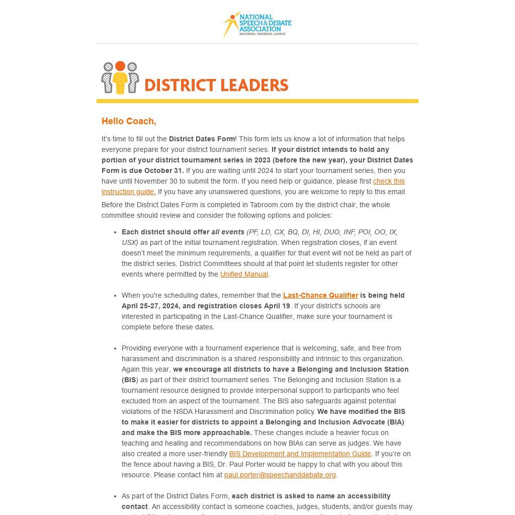 As part of the District Dates Form, each district is asked to name an accessibility contact. An accessibility contact is someone coaches, judges, students, and/or guests may contact if they have questions or concerns about access or wellness before and/or during the tournament. If you have a Belonging and Inclusion Advocate, you could ask them to serve as the accessibility contact as well. For more information, please contact Dr. Paul Porter at paul.porter@speechanddebate.org.