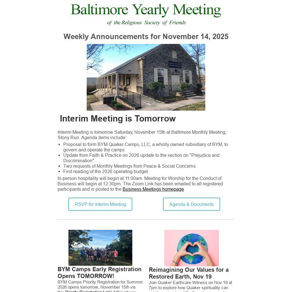 Interim Meeting is tomorrow Saturday, November 15th at Baltimore Monthly Meeting, Stony Run. Agenda items include:
