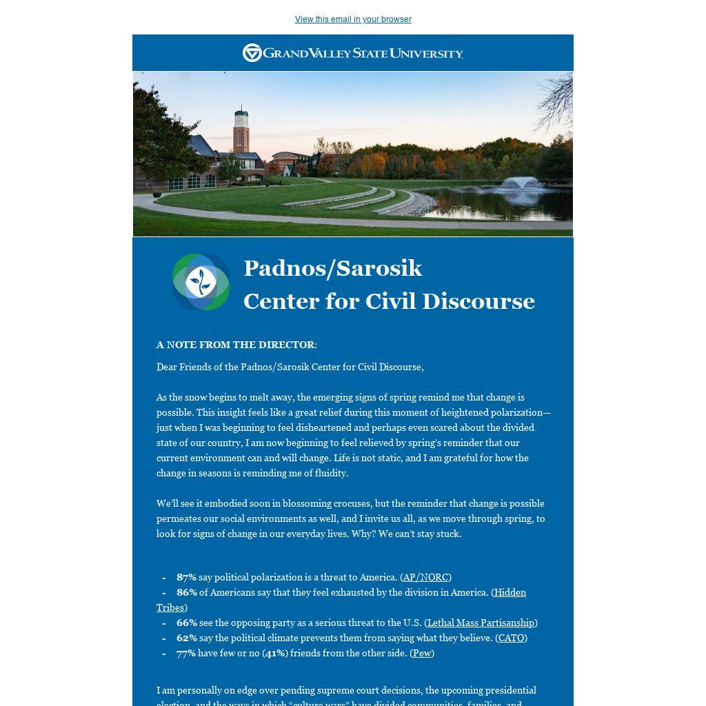 Dear Friends of the Padnos/Sarosik Center for Civil Discourse,