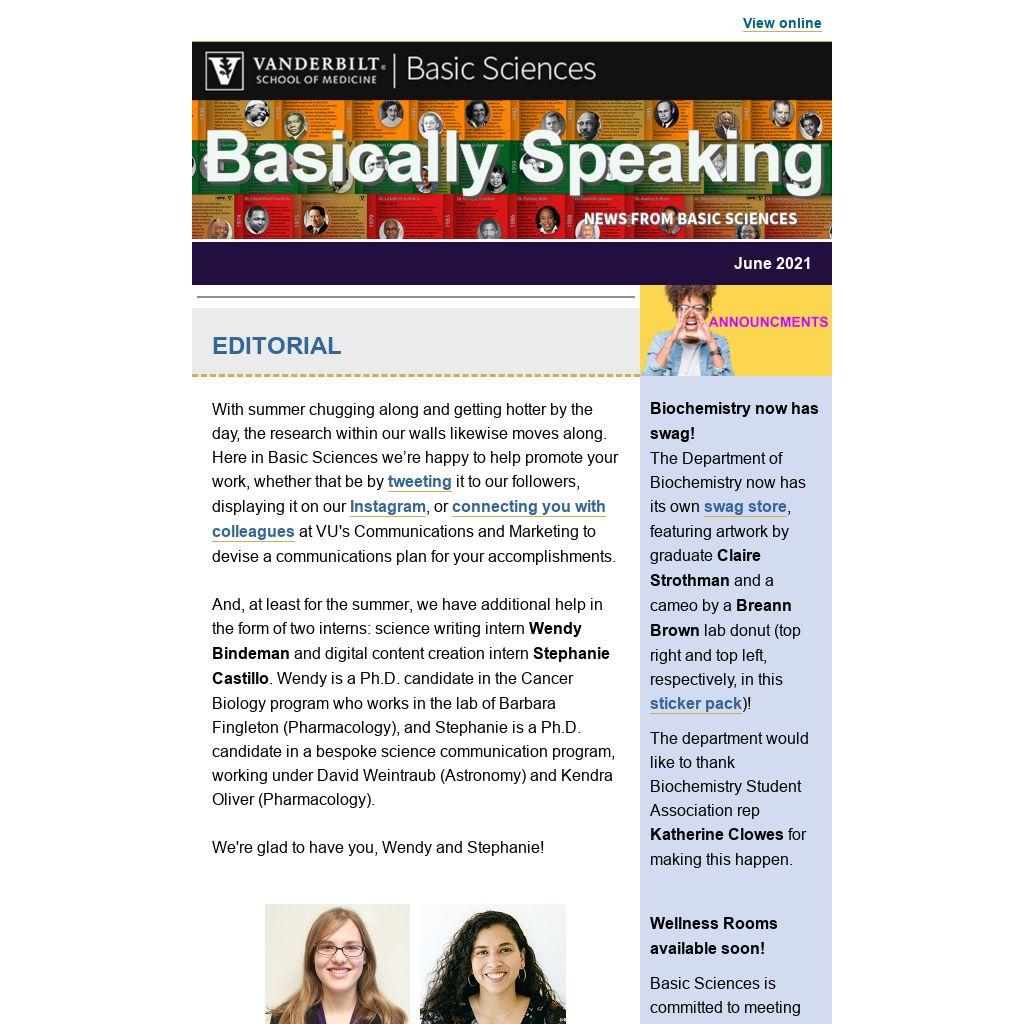 And, at least for the summer, we have additional help in the form of two interns: science writing intern Wendy Bindeman and digital content creation intern Stephanie Castillo. Wendy is a Ph.D. candidate in the Cancer Biology program who works in the lab of Barbara Fingleton (Pharmacology), and Stephanie is a Ph.D. candidate in a bespoke science communication program, working under David Weintraub (Astronomy) and Kendra Oliver (Pharmacology).