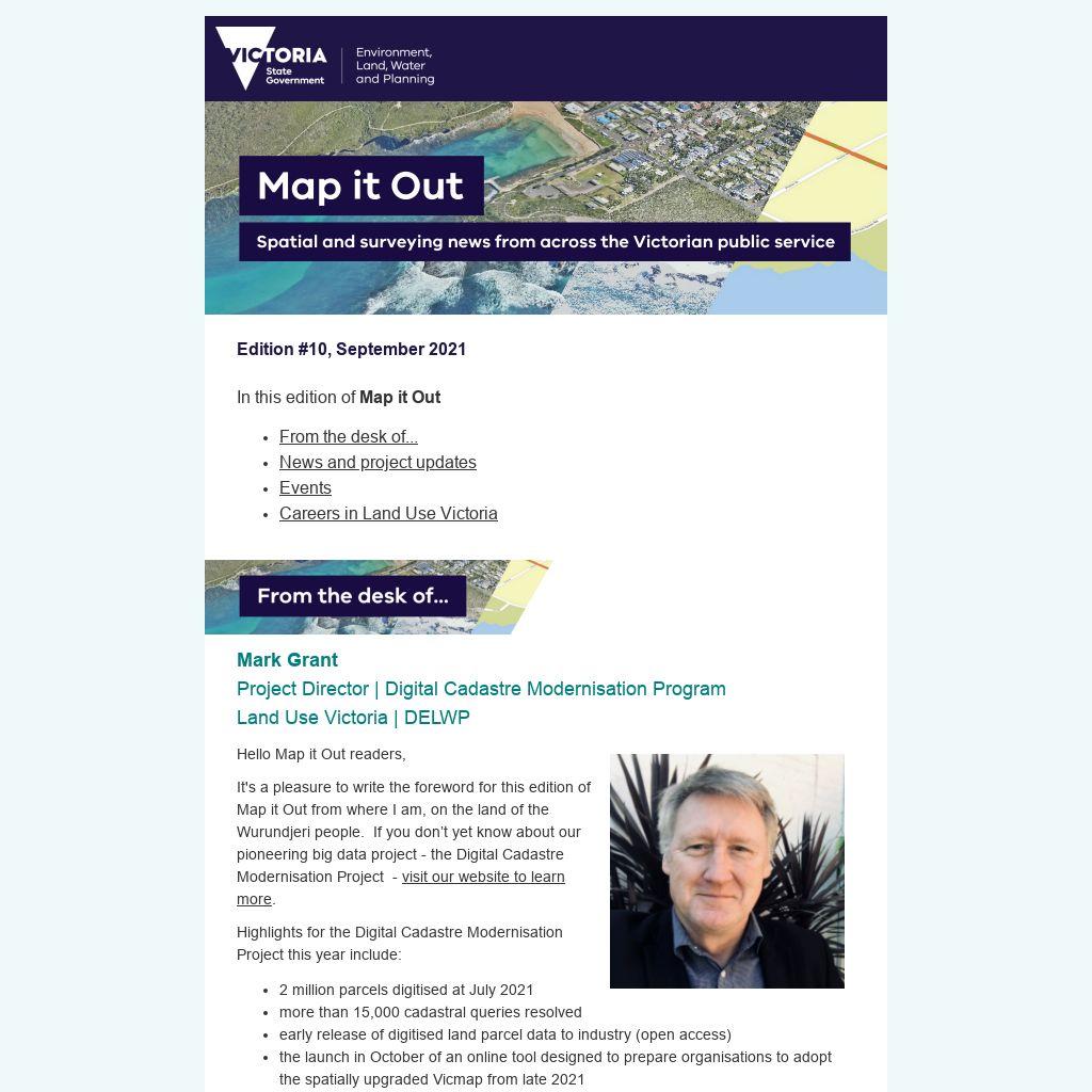It's a pleasure to write the foreword for this edition of Map it Out from where I am, on the land of the Wurundjeri people. If you don’t yet know about our pioneering big data project - the Digital Cadastre Modernisation Project - visit our website to learn more.