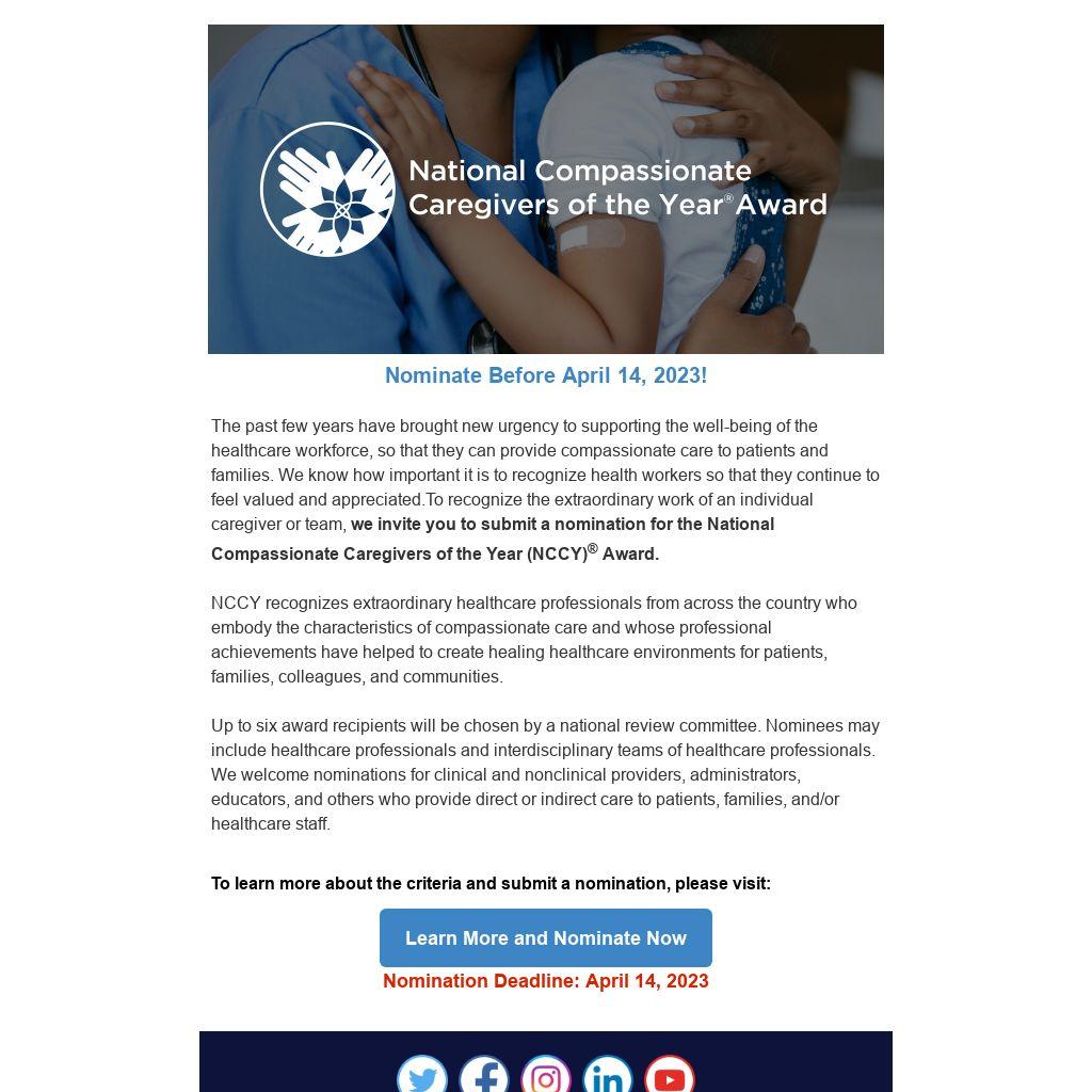 The past few years have brought new urgency to supporting the well-being of the healthcare workforce, so that they can provide compassionate care to patients and families. We know how important it is to recognize health workers so that they continue to feel valued and appreciated.To recognize the extraordinary work of an individual caregiver or team, we invite you to submit a nomination for the National Compassionate Caregivers of the Year (NCCY)® Award.
