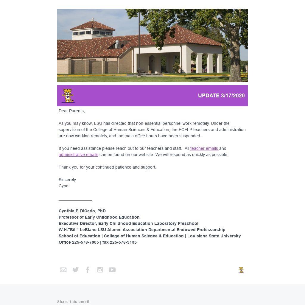 As you may know, LSU has directed that non-essential personnel work remotely. Under the supervision of the College of Human Sciences & Education, the ECELP teachers and administration are now working remotely, and the main office hours have been suspended.