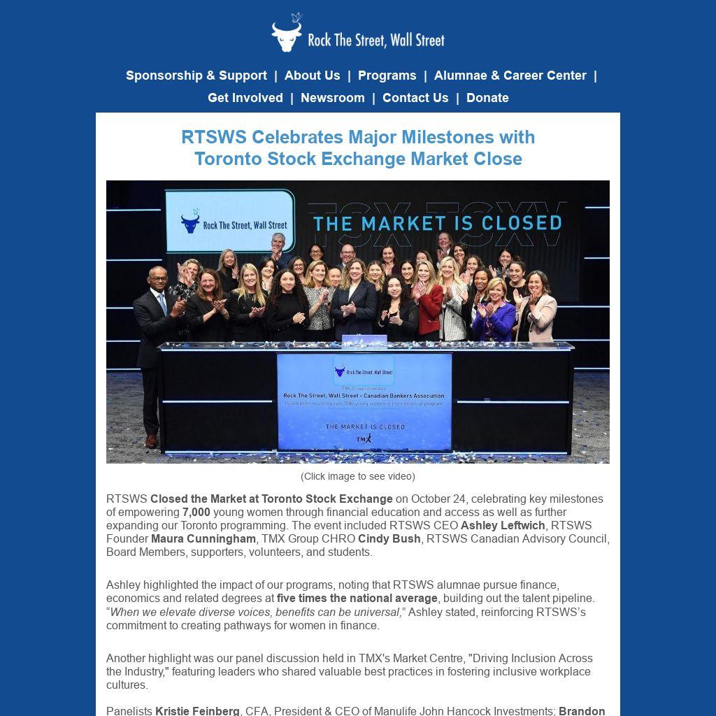RTSWS Closed the Market at Toronto Stock Exchange on October 24, celebrating key milestones of empowering 7,000 young women through financial education and access as well as further expanding our Toronto programming. The event included RTSWS CEO Ashley Leftwich, RTSWS Founder Maura Cunningham, TMX Group CHRO Cindy Bush, RTSWS Canadian Advisory Council, Board Members, supporters, volunteers, and students.