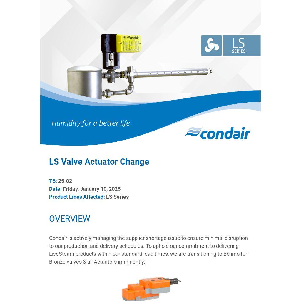 Condair is actively managing the supplier shortage issue to ensure minimal disruption to our production and delivery schedules. To uphold our commitment to delivering LiveSteam products within our standard lead times, we are transitioning to Belimo for Bronze valves & all Actuators imminently.