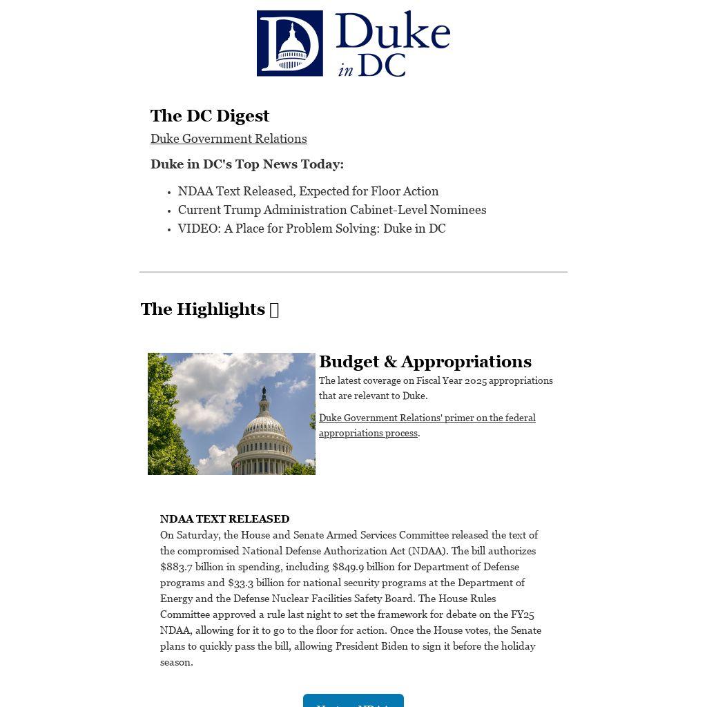 Duke in DC is the university’s home in the nation’s capital. We work with policymakers, academics, researchers, alumni and the higher education community to advance the intellectual life of the university beyond campus. Founded in April of 2012, Duke’s previously decentralized activities gained a home base and a permanent presence in the heart of Washington. Duke in DC hosts academic programs, DC-based university faculty and staff, alumni receptions and meetings, as well as other activities and events related to official university business in Washington.