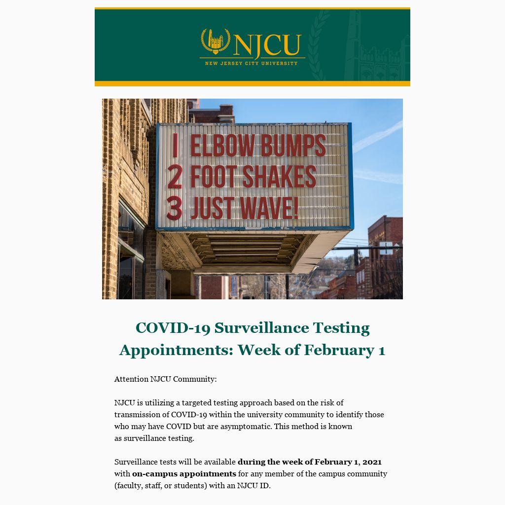 Surveillance tests will be available during the week of February 1, 2021 with on-campus appointments for any member of the campus community (faculty, staff, or students) with an NJCU ID.