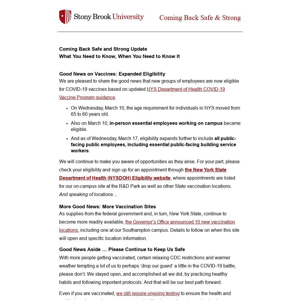 We will continue to make you aware of opportunities as they arise. For your part, please check your eligibility and sign up for an appointment through the New York State Department of Health (NYSDOH) Eligibility website, where appointments are listed for our on-campus site at the R&D Park as well as other State vaccination locations. And speaking of locations ...