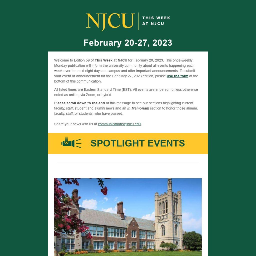 Welcome to Edition 59 of This Week at NJCU for February 20, 2023. This once-weekly Monday publication will inform the university community about all events happening each week over the next eight days on campus and offer important announcements. To submit your event or announcement for the February 27, 2023 edition, please use the form at the bottom of this communication.