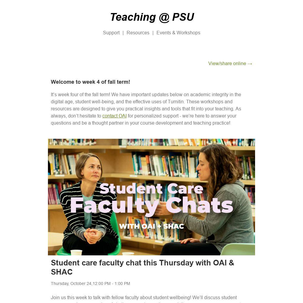 It’s week four of the fall term! We have important updates below on academic integrity in the digital age, student well-being, and the effective uses of Turnitin. These workshops and resources are designed to give you practical insights and tools that fit into your teaching. As always, don’t hesitate to contact OAI for personalized support - we’re here to answer your questions and be a thought partner in your course development and teaching practice!