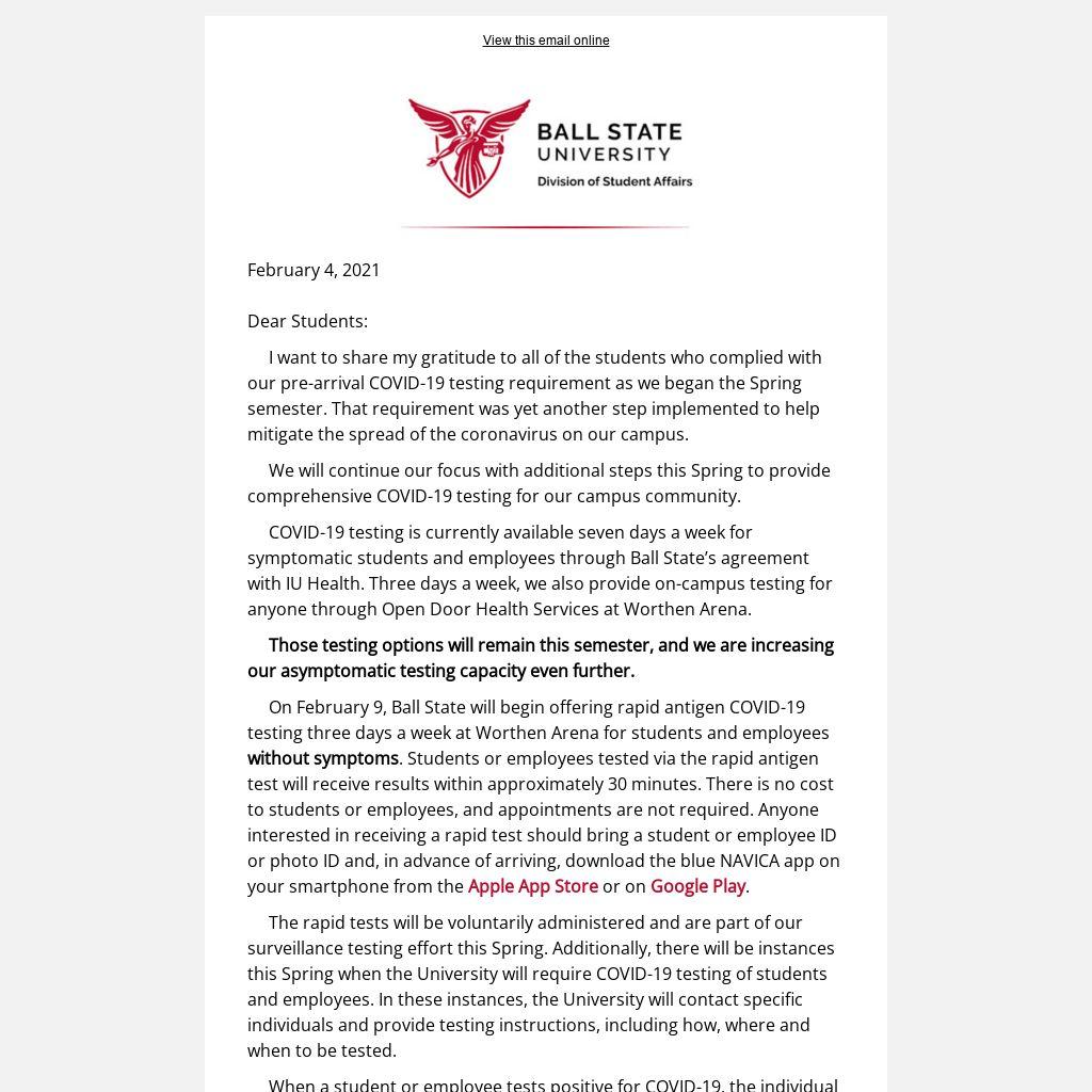 On February 9, Ball State will begin offering rapid antigen COVID-19 testing three days a week at Worthen Arena for students and employees without symptoms. Students or employees tested via the rapid antigen test will receive results within approximately 30 minutes. There is no cost to students or employees, and appointments are not required. Anyone interested in receiving a rapid test should bring a student or employee ID or photo ID and, in advance of arriving, download the blue NAVICA app on your smartphone from the Apple App Store or on Google Play.