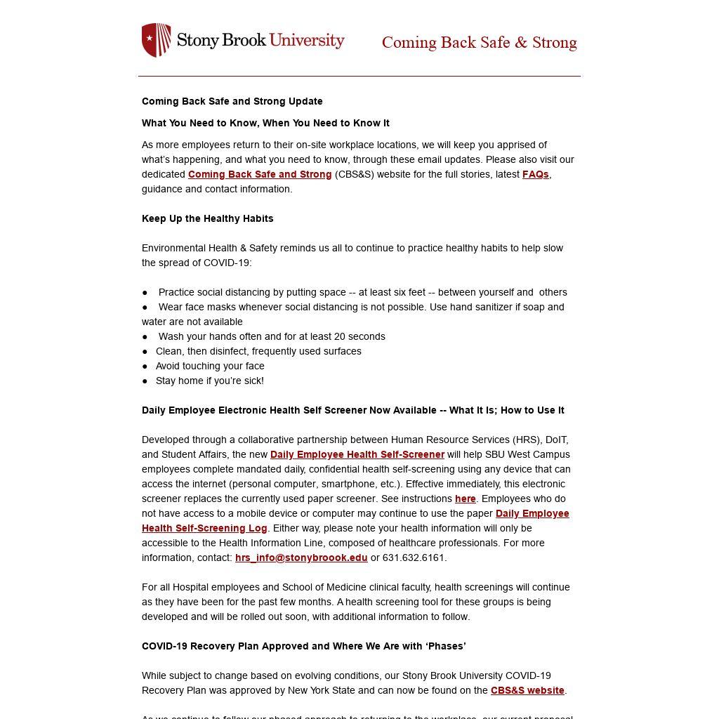 Developed through a collaborative partnership between Human Resource Services (HRS), DoIT, and Student Affairs, the new Daily Employee Health Self-Screener will help SBU West Campus employees complete mandated daily, confidential health self-screening using any device that can access the internet (personal computer, smartphone, etc.). Effective immediately, this electronic screener replaces the currently used paper screener. See instructions here. Employees who do not have access to a mobile device or computer may continue to use the paper Daily Employee Health Self-Screening Log. Either way, please note your health information will only be accessible to the Health Information Line, composed of healthcare professionals. For more information, contact: hrs_info@stonybroook.edu or 631.632.6161. For all Hospital employees and School of Medicine clinical faculty, health screenings will continue as they have been for the past few months. A health screening tool for these groups is being developed and will be rolled out soon, with additional information to follow. COVID-19 Recovery Plan Approved and Where We Are with ‘Phases’