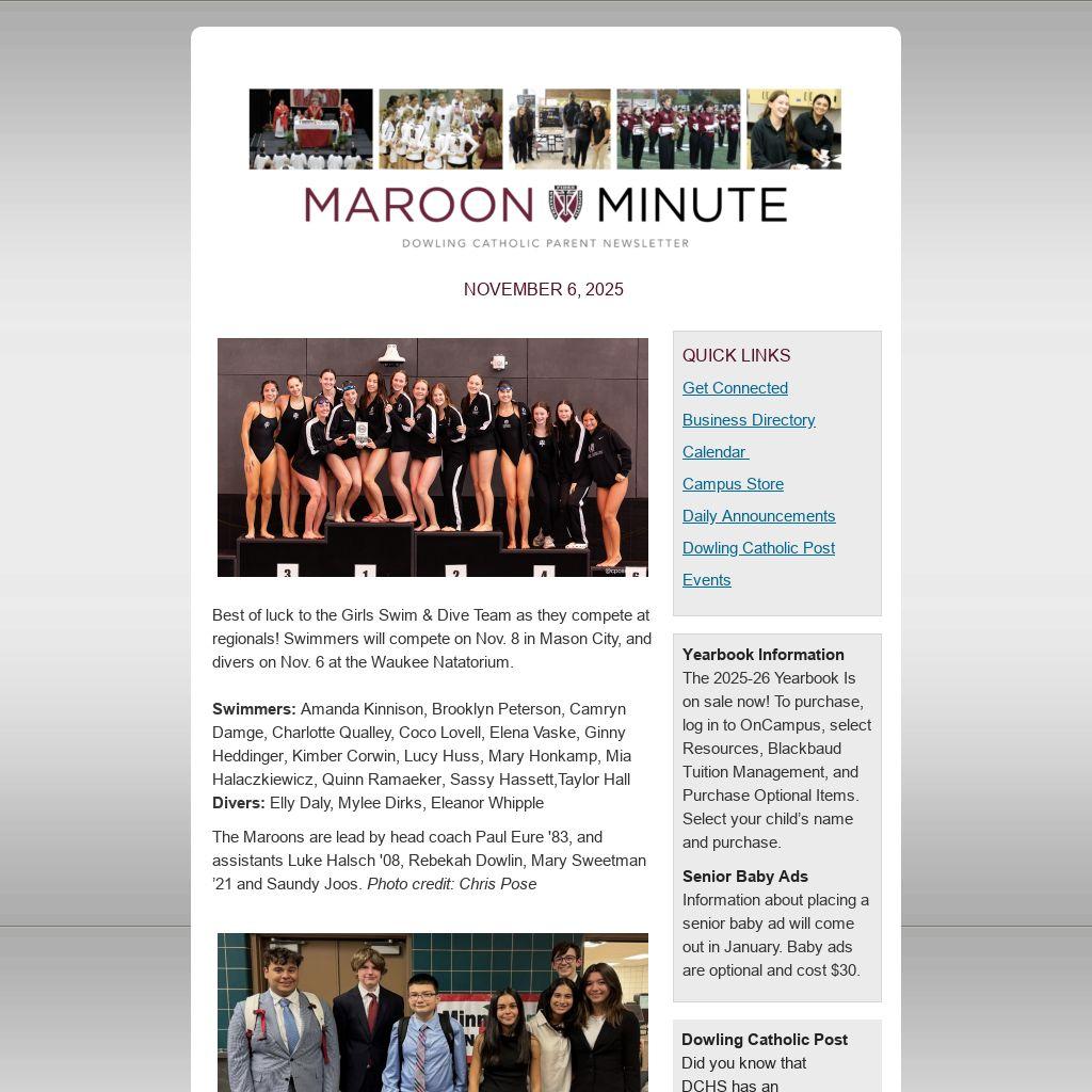 Maroon Fund, Dowling Catholic's Annual Appeal, to help us prepare Leaders for Life, Centered on Christ. Your gift strengthens every aspect of the student experience by supporting three essential pillars: Academic ExcellenceStudent & Faith Life, and School Services. To learn more or make a gift, please visit our website. Checks may be mailed to DCHS, 1400 Buffalo Road, West Des Moines, IA 50265. Thank you for your support!