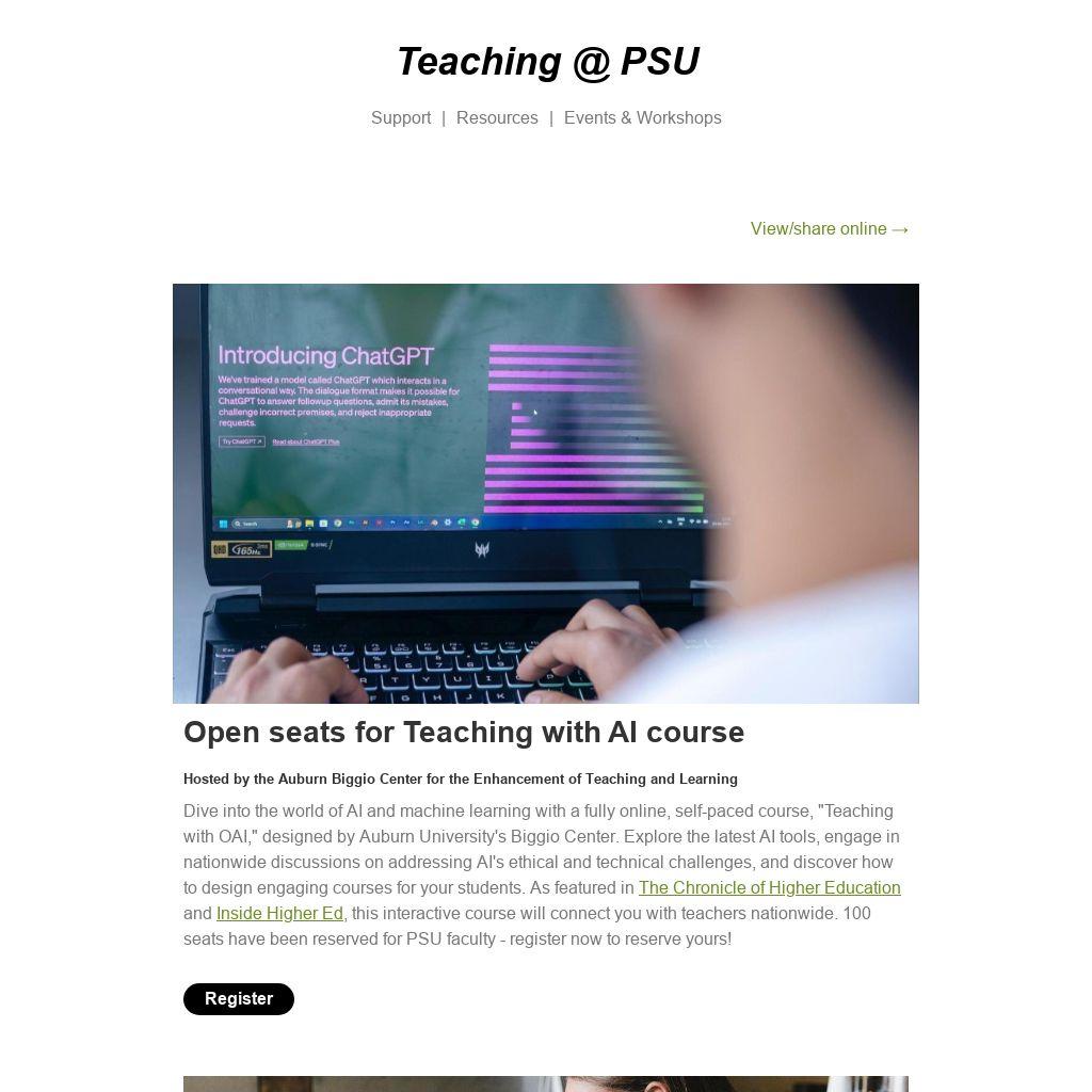 Dive into the world of AI and machine learning with a fully online, self-paced course, "Teaching with OAI," designed by Auburn University's Biggio Center. Explore the latest AI tools, engage in nationwide discussions on addressing AI's ethical and technical challenges, and discover how to design engaging courses for your students. As featured in The Chronicle of Higher Education and Inside Higher Ed, this interactive course will connect you with teachers nationwide. 100 seats have been reserved for PSU faculty - register now to reserve yours!