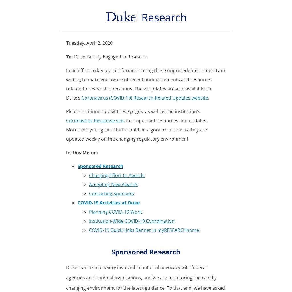 Duke leadership is very involved in national advocacy with federal agencies and national associations, and we are monitoring the rapidly changing environment for the latest guidance. To that end, we have asked grant managers to work with you to maintain documentation of certain issues that will be used in future reporting to sponsors and to support potential supplemental funding to offset the financial impacts of COVID-19 on your research.