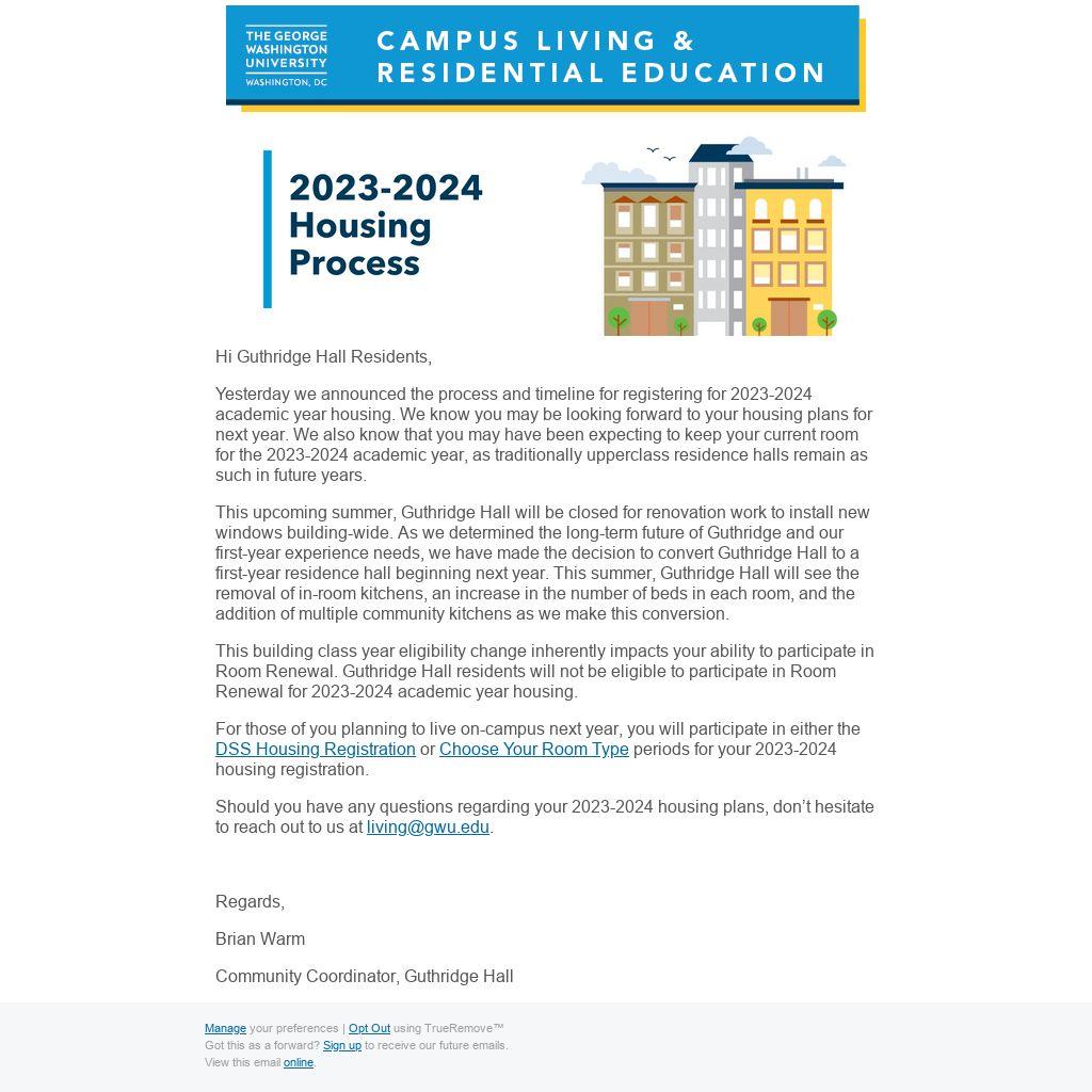 Should you have any questions regarding your 2023-2024 housing plans, don’t hesitate to reach out to us at living@gwu.edu.
