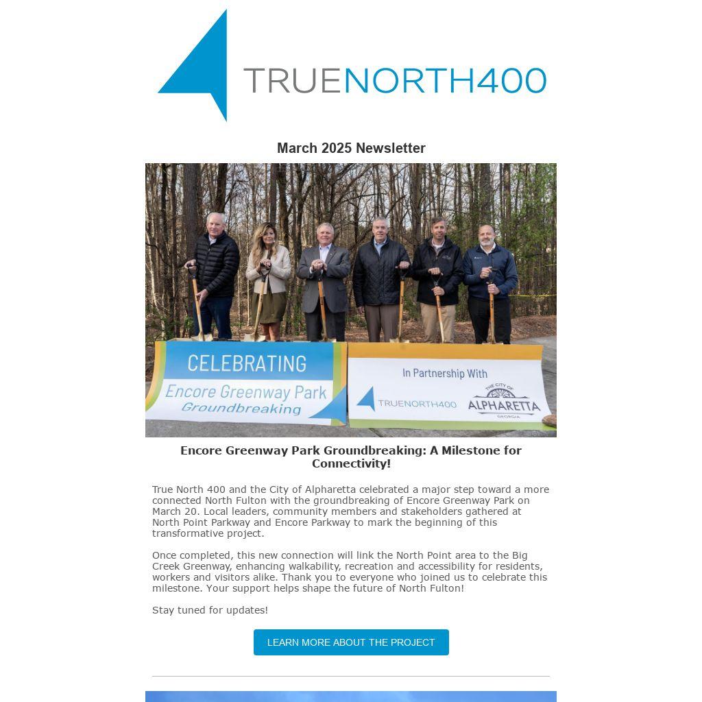 True North 400 and the City of Alpharetta celebrated a major step toward a more connected North Fulton with the groundbreaking of Encore Greenway Park on March 20. Local leaders, community members and stakeholders gathered at North Point Parkway and Encore Parkway to mark the beginning of this transformative project.