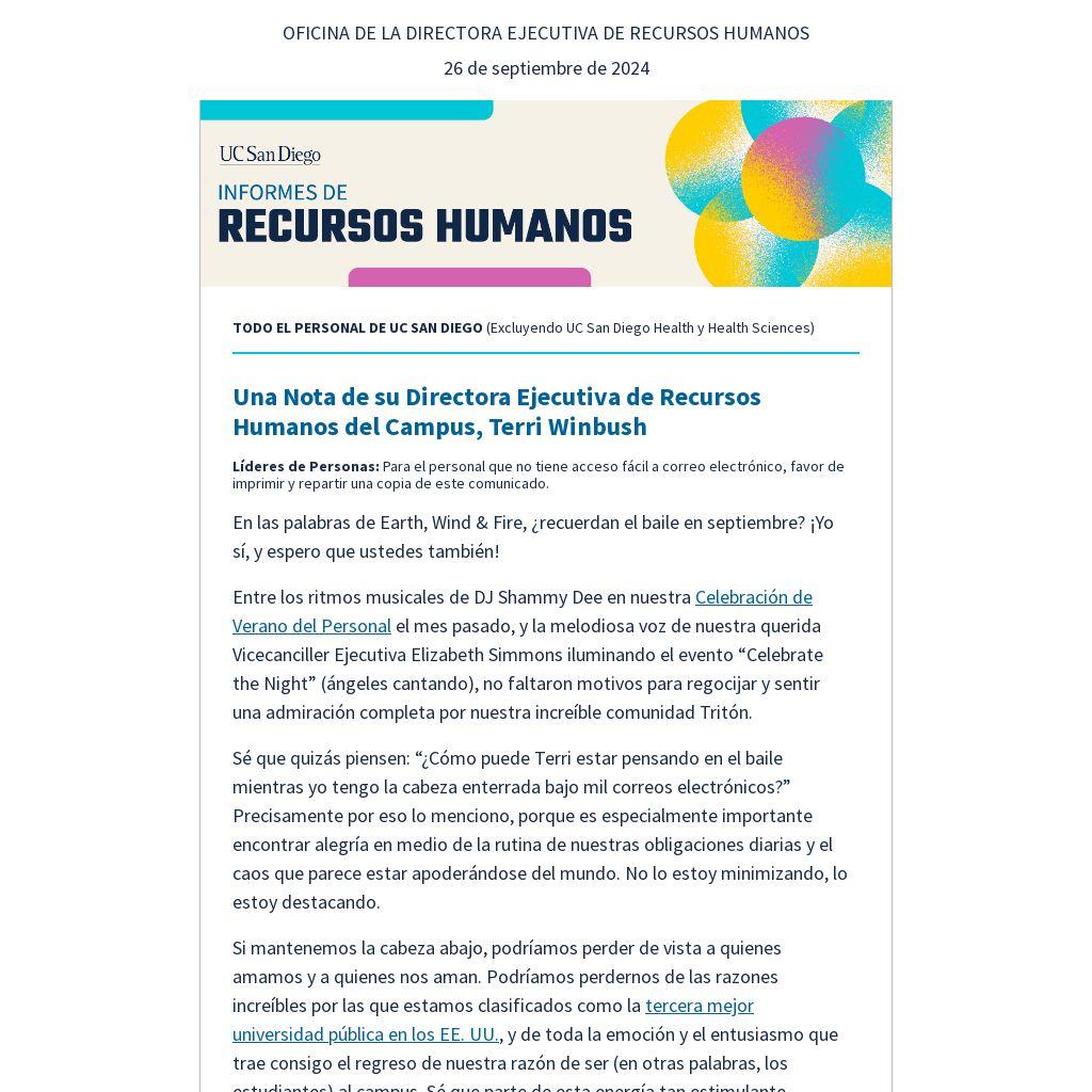 En octubre se lanzará una capacitación obligatoria a nivel del sistema sobre la prevención de la violencia en el lugar de trabajo, en apoyo al Programa de Prevención de la Violencia en el Lugar de Trabajo y de acuerdo con los requisitos de la sección 6401.9 del Código Laboral de California. Este requisito es aplicable a todos los empleados de UC San Diego, incluyendo personal administrativo, académico y empleados estudiantiles. La capacitación, que dura 25 minutos, se asignará a través del UC Learning Center la semana del 7 de octubre de 2024, y deberá completarse dentro de los 60 días posteriores a la asignación. Más información se enviará en las próximas semanas a través de un aviso del campus.