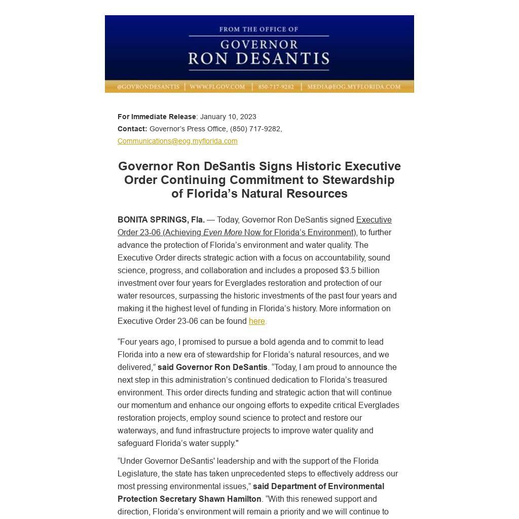 BONITA SPRINGS, Fla. — Today, Governor Ron DeSantis signed Executive Order 23-06 (Achieving Even More Now for Florida’s Environment), to further advance the protection of Florida’s environment and water quality. The Executive Order directs strategic action with a focus on accountability, sound science, progress, and collaboration and includes a proposed $3.5 billion investment over four years for Everglades restoration and protection of our water resources, surpassing the historic investments of the past four years and making it the highest level of funding in Florida’s history. More information on Executive Order 23-06 can be found here.