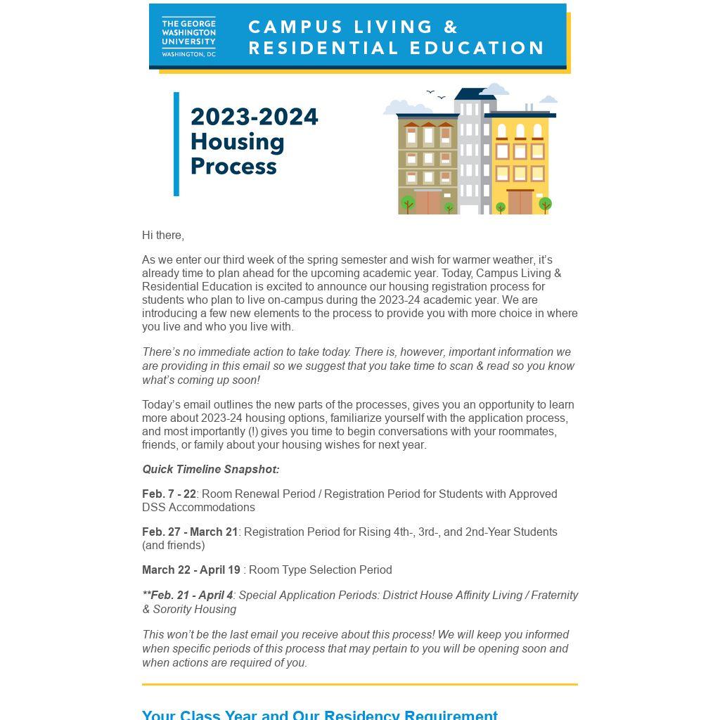 Today’s email provided you an outline of the 2023-24 housing process and we know you may have questions regarding details on specific periods of the process or situations important to understand as you think about your 2023-2024 housing. Before emailing us, spend time reading further about the housing process and review the FAQs for returning students.