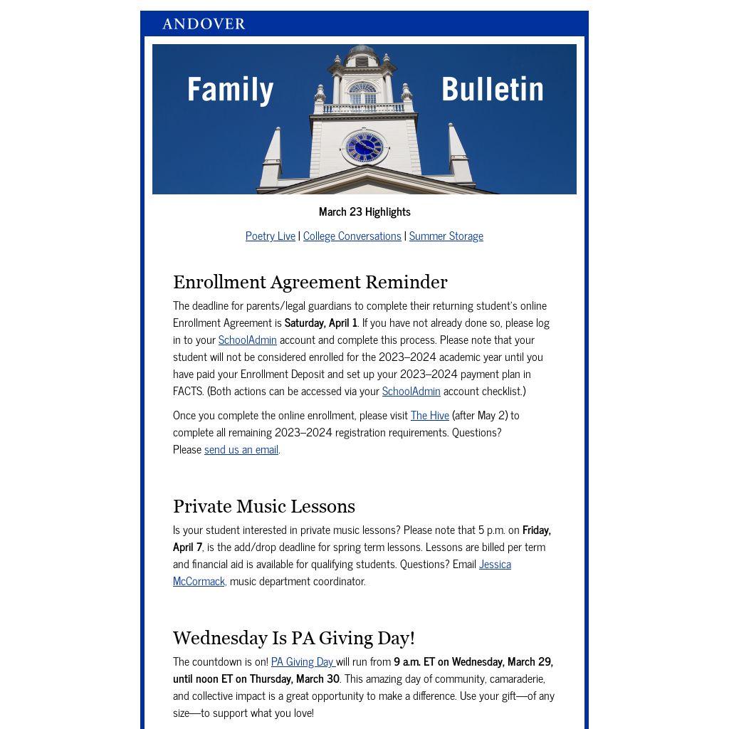 You received this message because you are a valued member of the Andover community. We are obligated to communicate with you, and require you to be on our email list while your student(s) attends Phillips Academy. For more information contact the Dean of Studies Office. |