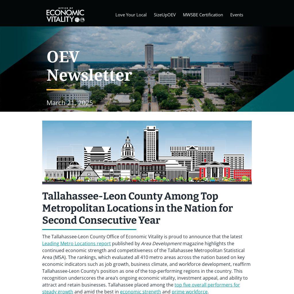 Delve into past issues of the OEV Newsletter to catch up on updates, insights, economic development initiatives, programs, and opportunities in Tallahassee-Leon County!