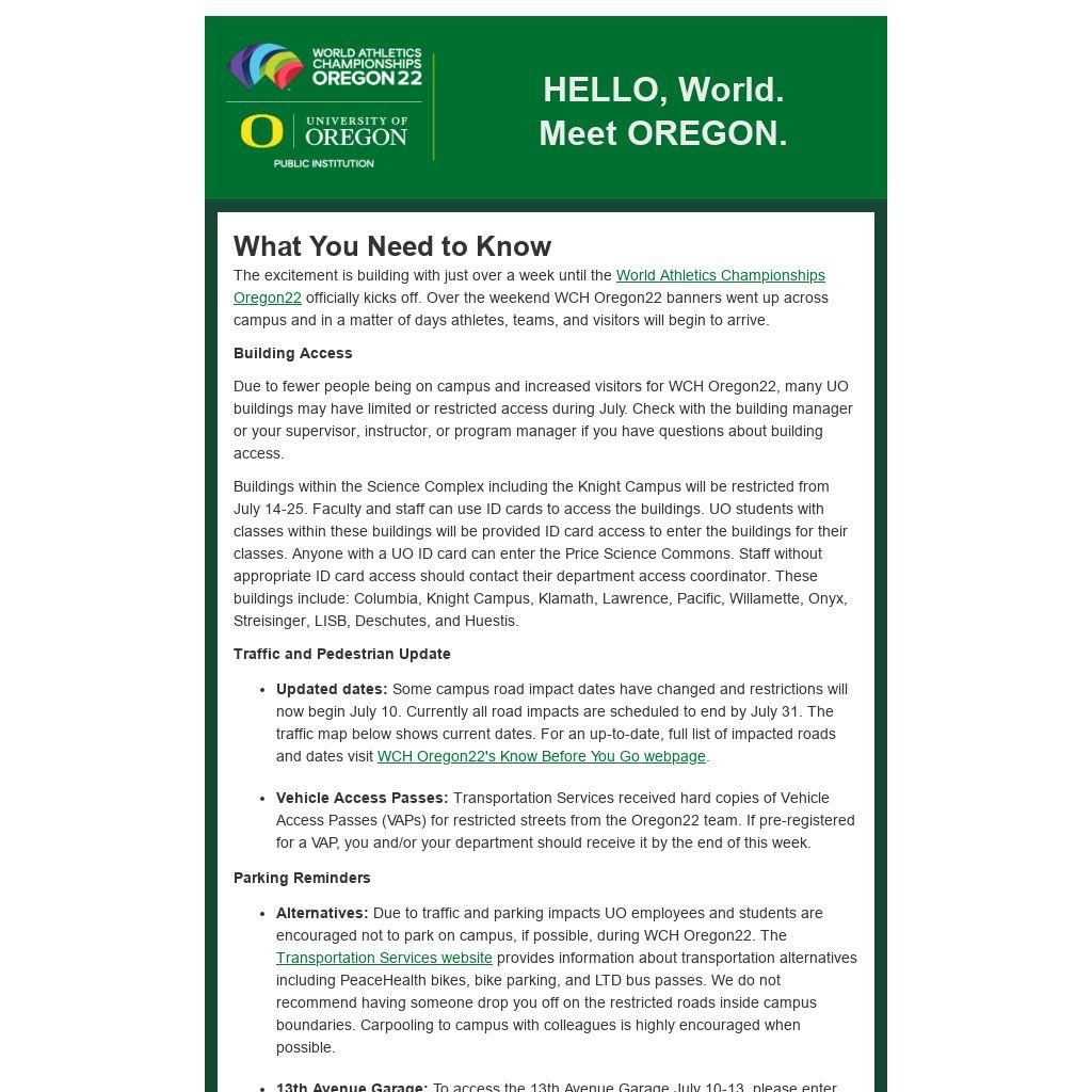 - Vehicle Access Passes: Transportation Services received hard copies of Vehicle Access Passes (VAPs) for restricted streets from the Oregon22 team. If pre-registered for a VAP, you and/or your department should receive it by the end of this week.